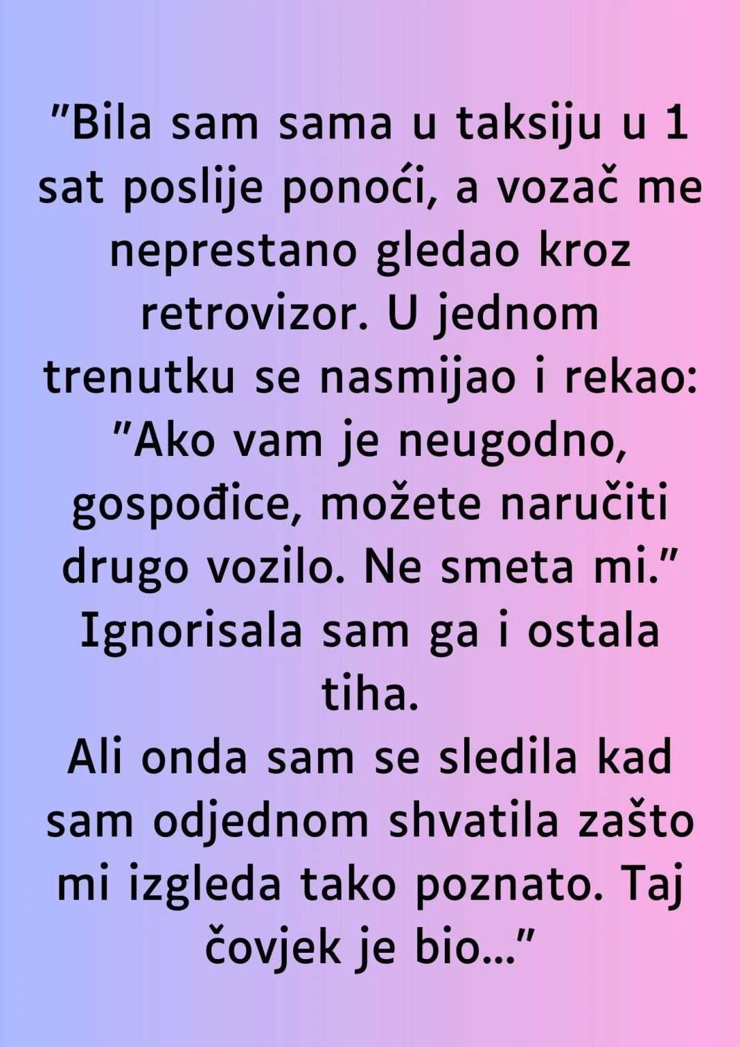 Bila je to sasvim obična večer, bez ikakvih nagovještaja da bi se išta neobično moglo desiti. Plan je bio jednostavan – kratka vožnja taksijem, rutinska i poznata. Kada je ušla u vozilo, sve je djelovalo potpuno normalno. Vozač je bio pristojan, cesta mirna, a atmosfera bez ikakvih znakova nervoze. Ipak, samo nekoliko minuta kasnije, mlada žena je osjetila da nešto ne štima. Vozač je uporno bacao poglede u retrovizor, kao da procjenjuje svaki njen pokret. Ta sitna, ali neprestana radnja počela joj se uvlačiti pod kožu.