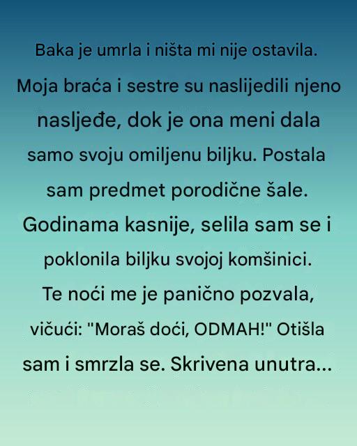Kada je moja nena umrla, svi smo očekivali da će čitanje testamenta doneti jasnoću. Moj brat i sestra su dobili dragoceni nakit i porodične predmete, dok sam ja, pomalo iznenađujuće, dobio samo jednu biljku. Nije bila posebna — obična, sa izblijedjelim listovima i krhkim granama. Brat se sprdao s njom, nazivajući je „sažaljivi saksija-poklon“, dok je sestra pitala da li joj treba uputstvo kako da je ne ubije. Iako sam se smeškao zajedno s njima, nešto u meni je zaboljelo. Nisam znao da ta biljka nosi sa sobom priču koja će potpuno promeniti moj pogled na svoju porodicu i nenu koju sam mislio da poznajem.