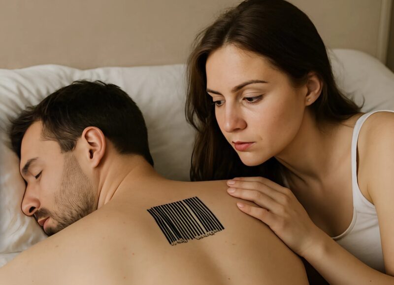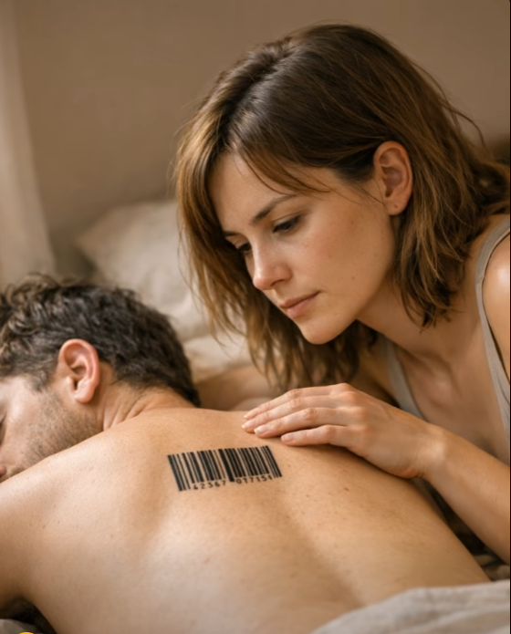 Jednog dana, dok je njen muž spavao, primijetila je da ima novu tatu na leđima, tik uz vrat. U početku je to bila obična tetovaža, ali onda je shvatila da se radi o nečemu puno ozbiljnijem. Tetovaža je bila štampani kod, nešto nalik barcode-u, a to nije bila obična slika. U tom trenutku osjetila je duboku nelagodu i uznemirenost. Zašto je napravio tu tatu? I što znači? Zašto joj nije ništa rekao?