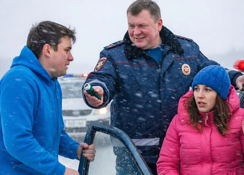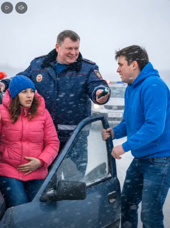 Policajac, koji je bio sklon držati se pravilima, nije imao saosećanja za trudnicu koja je bila na ivici porođaja. Inspektor je tražio da se vozač podvrgne testu na alkohol, uprkos očitoj hitnosti situacije. Iako je vozač priznao da je popio čašu pre nekoliko sati, inspektor je odlučio da oduzme vozačku dozvolu i naloži da vozilo bude parkirano. Žena u bolovima, vozač bez vozačke dozvole i snijeg koji je sve gutao – situacija nije bila jednostavna.