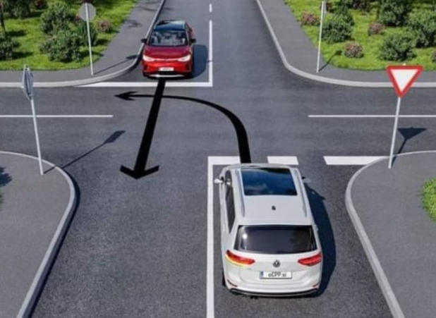 S druge strane, instruktori vožnje i saobraćajni priručnici često objašnjavaju da znak „STOP“ u stvari ne daje automatski prednost. Oni navode da je bitno uzeti u obzir činjenicu da beli automobil skreće levo, što menja dinamiku saobraćaja. Iako je crveni automobil obavezan da se zaustavi, pravilo skretanja levo znači da beli automobil mora da propusti crveni, jer se uklapa u njegovu putanju, koja ide pravo. Ova teorija podržava osnovno pravilo saobraćaja: vozilo koje ide pravo ima prednost pred onim koje skreće, bez obzira na to da li se zaustavilo ili ne.