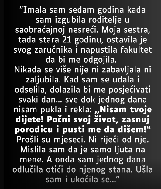 Kada sam imala samo sedam godina, doživela sam tragediju koja mi je zauvek promenila život. U saobraćajnoj nesreći izgubila sam oba roditelja, a taj trenutak je oblikovao moju sudbinu. Moja sestra, tada sa 21 godinom, donela je veliku odluku – napustila je svog zaručnika i fakultet da bi se potpuno posvetila mom odgoju. Nikada neću zaboraviti njenu hrabrost i nesebičnost tog trenutka. Preuzela je odgovornost za mene, a njeno srce i duša posvetili su se isključivo tome da obezbedi meni siguran i ljubavlju ispunjen dom.