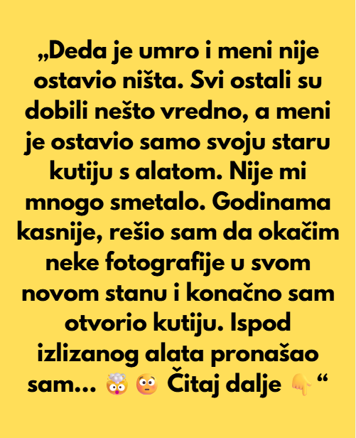 Umesto toga, jedino što sam dobio bila je njegova stara kutija sa alatom, zarđala i napola prazna. Dok su se moji rođaci smeštali sa svojim bogatstvom, šaleći se da sam “dobio deblji kraj”, nisam se mnogo brinuo. Oduvek sam bio taj koji je dedu pomagao u popravkama po kući, pa je kutija, ma koliko bila neprivlačna, imala svoju vrednost u mom srcu. Držao sam je na polici i nikada nisam pomerio ništa iz nje, ostavljajući je netaknutu, baš kako ju je on ostavio.