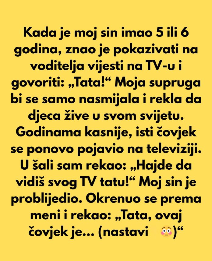Priča koju želimo podijeliti započinje kao šala, no vrlo brzo se pretvara u trenutak istine koji mijenja sve. Otac se prisjeća jednog trenutka iz prošlosti kada je njegov sin, još kao dijete, pokazivao na TV voditelja i nazivao ga “tatom”.
