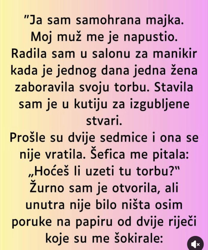 Jednog dana, tokom svoje smene u salonu, klijentkinja je zaboravila torbu. Prvo nisam obratila puno pažnje na to, ali sam je ipak spakovala u kutiju za izgubljene stvari, misleći da će se ona vratiti po nju. Dani su prolazili, a torba je ostala u kutiji, čekajući da je neko uzme. Prošle su dve sedmice, a niko nije došao po nju.