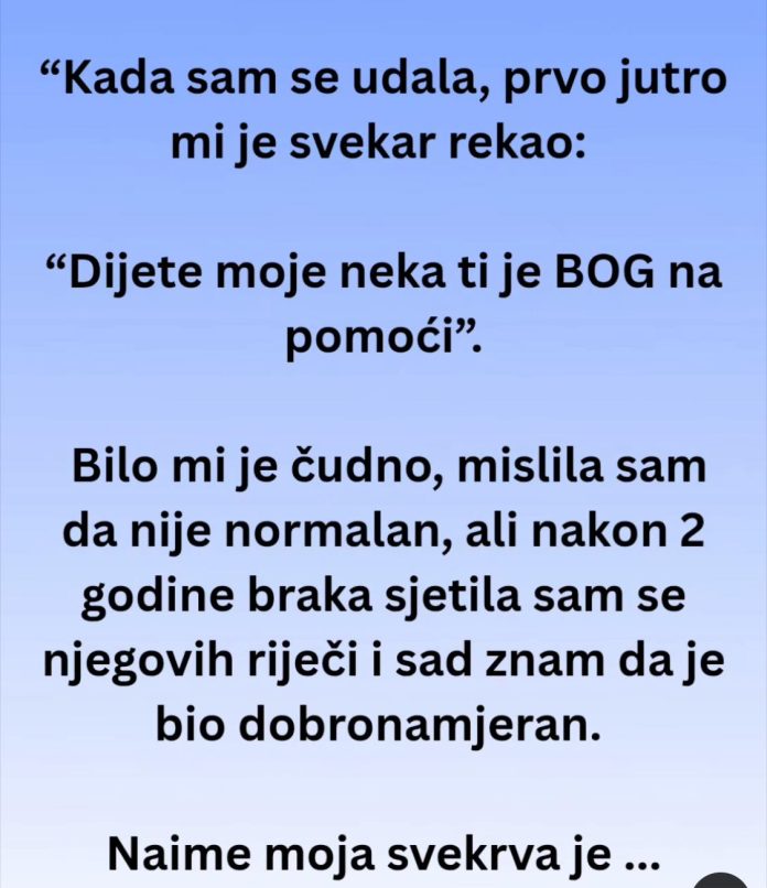 Kada se udala, mislila je da počinje novo, sretno poglavlje života. Sve je djelovalo savršeno – ljubav, razumijevanje i zajednički planovi. Ali već prvog jutra, njen svekar joj je, s blagim osmijehom, rekao rečenicu koja će joj se urezati u pamćenje: „Dijete moje, neka ti je Bog na pomoći.“ Tada joj se učinilo da pretjeruje, mislila je da se šali ili da je star čovjek koji govori iz navike. No, dvije godine kasnije, te riječi su joj odjekivale u glavi kao proročanstvo.
