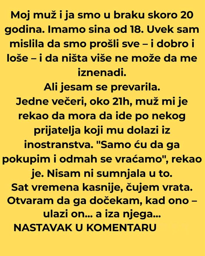 Te večeri, sve je izgledalo sasvim obično. Muž joj je rekao da ide po prijatelja koji stiže iz inostranstva i da će se brzo vratiti. Nije bilo nervoze u njegovom glasu, nije bilo skrivanja pogleda. Takve stvari se u dugim brakovima ne dovode u pitanje. Povjerenje se, barem je ona tako mislila, podrazumijeva.