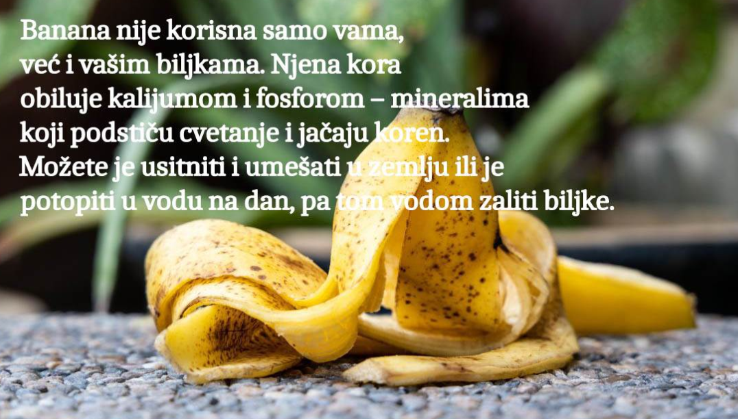 Kore od banane su još jedan odličan saveznik. Bogate fosforom, pomažu razvoju novih listova i jačanju korijena. Mogu se sitno isjeckati i zakopati u saksiju ili potopiti u vodu kako bi se dobio blagi „čaj“ za zalivanje.