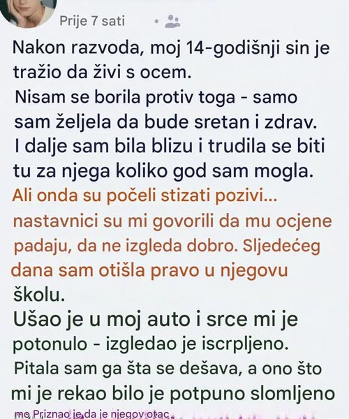 Kada je Marko odlučio da nakon razvoda živi kod svog oca, njegova majka je pokušala da ostane smirena i otvorena. Vjerovala je da je važno poštovati izbor djeteta, čak i onda kada majčinski instinkt tiho upozorava da bi moglo biti teško. Smatrala je da će mu ta promjena donijeti novu priliku za bliskost, za malo mira posle burnog perioda i za osjećaj povezanosti koji je dugo želio.