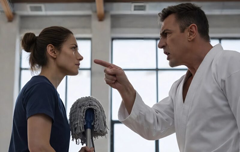 Djevojka nije reagovala burno. Nastavila je još jedan pokret mopom, a zatim smireno podigla pogled i objasnila da su je oni sami pozvali i da će brzo završiti posao. Nije pokazivala ni strah ni nervozu.To je dodatno razljutilo trenera. Njegov osmijeh postao je podrugljiv, a riječi još teže. Pokušao ju je zastrašiti, čak i prijetiti otkazom, iako ona nije radila za njega. Kada mu je mirno odgovorila da nema tu moć, situacija je postala još napetija.