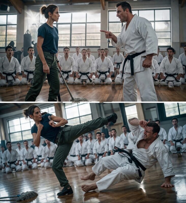 Djevojka je polako odložila mop i jasno rekla da neće trpjeti takvo ponašanje. Te riječi su odjeknule u tišini sale. Trener je, uvjeren u svoju nadmoć, zauzeo borbeni stav i odlučio da je zastraši ili ponizi pred svima.Napravio je brzi, samouvjereni pokret – onaj kojim je ranije dominirao nad drugima. Bio je siguran u ishod.Ali ono što se dogodilo narednog trenutka ostavilo je sve bez riječi.Djevojka se pomjerila s nevjerovatnom lakoćom, kao da je unaprijed znala šta slijedi. Izbjegla je njegov napad bez napora, a zatim reagovala brzo i precizno. Njeni pokreti bili su sigurni, uvježbani i potpuno kontrolisani.