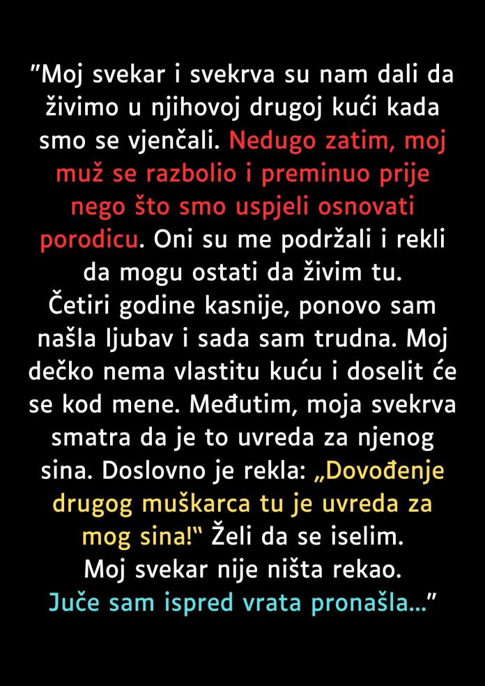 Međutim, nedugo nakon toga, moj muž je iznenada obolio i nažalost preminuo prije nego što smo uspjeli osnovati porodicu, što me duboko pogodilo. Tokom svih tih teških trenutaka, moji svekar i svekrva su bili uz mene, pružali su mi emocionalnu podršku i rekli mi da mogu ostati u njihovoj kući dok se ne snađem. Bilo mi je jasno da nisu željeli da idem, te sam se osjećala zahvalno za tu njihovu ljubaznost.