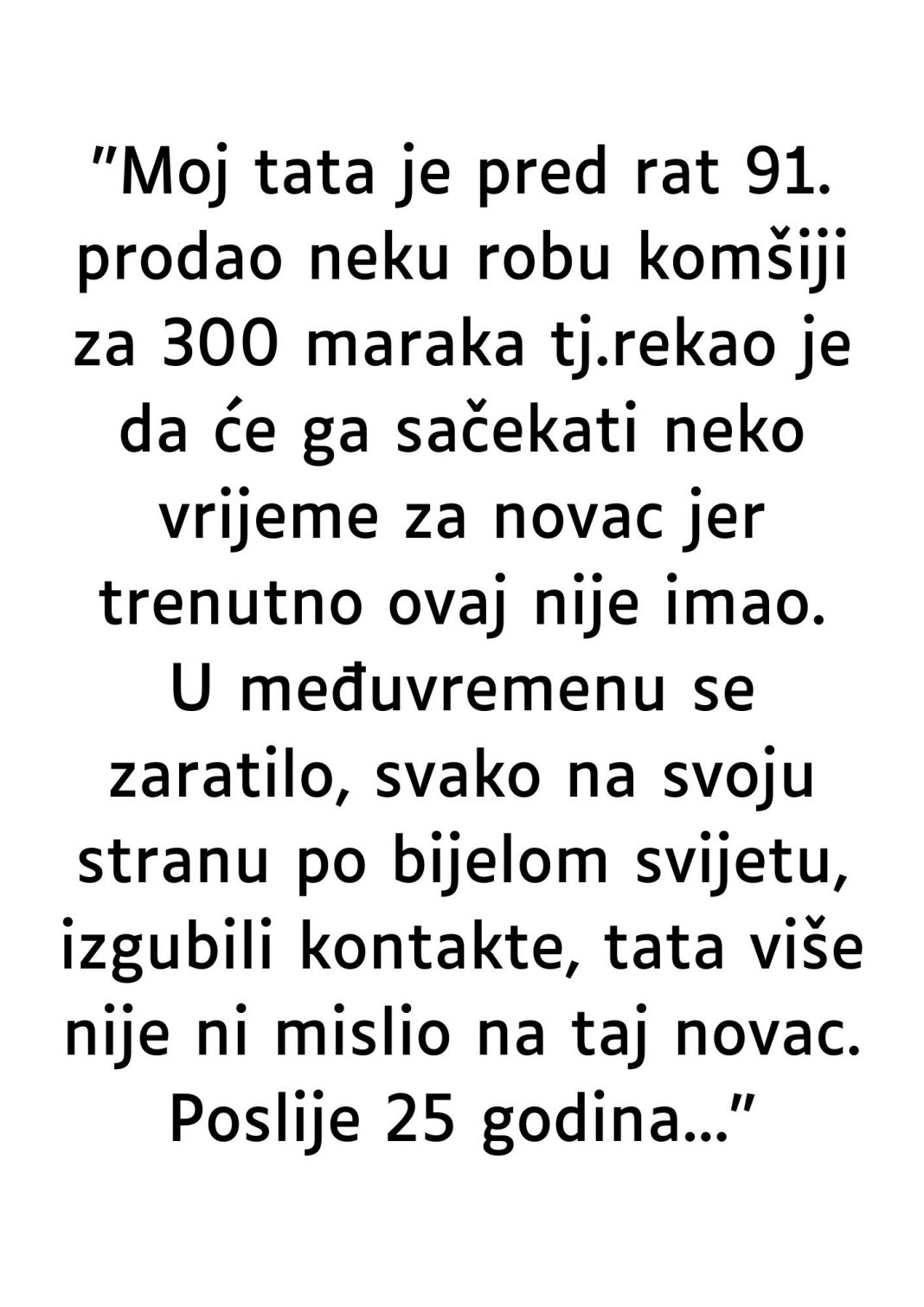 I tako je prošlo dvadeset i pet godina, a tijekom tog vremena, spomenuti susjed i moj otac nisu imali nikakvog kontakta. Rat je uzeo svoj danak, a svi su se nosili sa svojim životima na najteži mogući način. Međutim, jednog dana zvuk zvonjave fiksnog telefona, koji je nekako preživio kroz sve te godine, ponovo je ispunio prostoriju. Taj zvuk označavao je početak ponovnog uspostavljanja komunikacije. Bio je to susjed koji je sada živio u drugoj zemlji, ali i dalje je osjećao odgovornost prema obvezama koje je imao prema mom ocu.