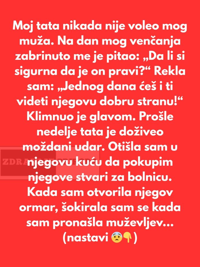 Iako je vreme prolazilo, tata nije menjao svoje mišljenje, a ja sam mislila da je to samo deo njegove zaštitničke prirode. Međutim, život je imao svoje planove, i tata je prošle nedelje doživeo moždani udar. Tog dana, kada sam obavestila svog muža, ništa nije bilo važno osim toga da bude uz mene. Uprkos tome što je imao važan poslovni sastanak, odmah je otkazao sve i bez oklijevanja dotrčao kako bi bio sa mnom. Bio je uz mene, pomažući mi da obezbedim potrebnu pomoć za moju porodicu. Nije se libio da se stavi na stranu porodice i pokazao mi da je uvek tu kad god zatreba.