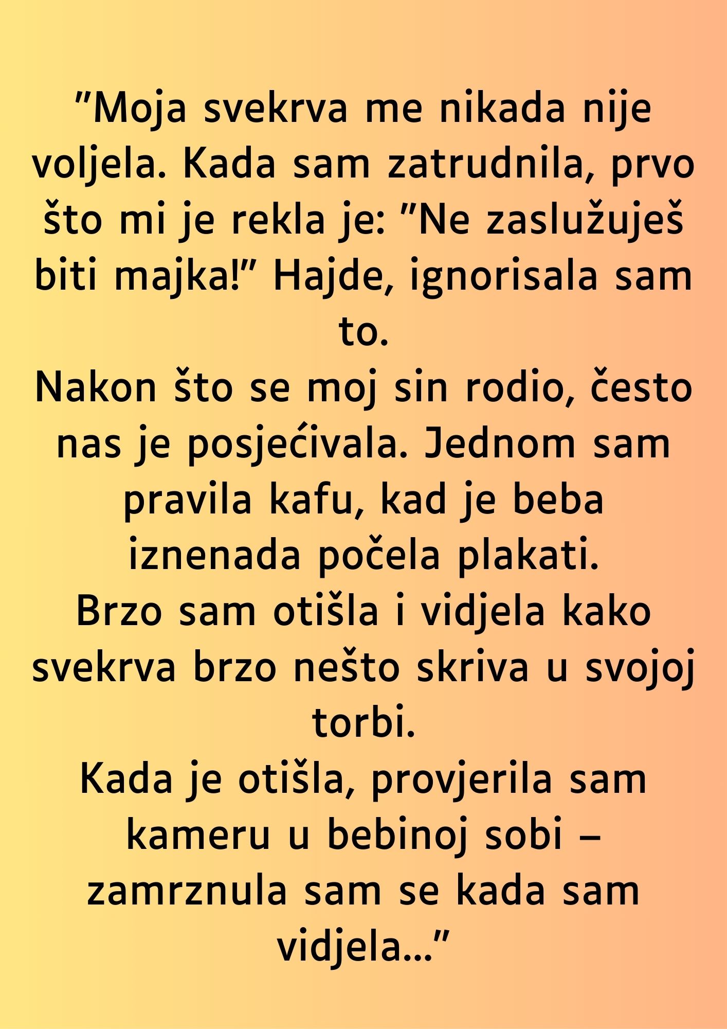 Kada se dječak rodio, činilo se da će odnosi barem malo omekšati. Svekrva je počela češće dolaziti u posjete i isprva je izgledalo kao da pokušava izgraditi vezu s unukom. Ali ubrzo se pokazalo da ti dolasci nisu motivisani ljubavlju. Jednog dana, dok je mlada majka pripremala kafu, čula je plač i potrčala u dječiju sobu. Zatekla je svekrvu kako nervozno skloni nešto u torbu. Nije znala šta je, ali osjećaj nelagode ostao je prisutan.