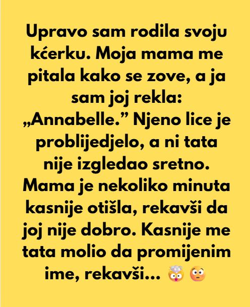 Mlada žena, tek postala majka, odlučila je da svojoj kćerki da ime Annabelle. Nije ga otkrila prije porođaja jer je imala loše iskustvo – član porodice je ranije „ukrao“ ime koje je planirala. Željela je da ovaj put bude drugačije, da trenutak pripada samo njoj i njenom mužu. Kada je, nakon rođenja, napokon izgovorila ime, reakcija njene majke sve je šokirala. Lice joj je problijedjelo, a otac, iako se trudio da ostane pribran, djelovao je napeto. Mama je ubrzo otišla, govoreći da joj nije dobro.