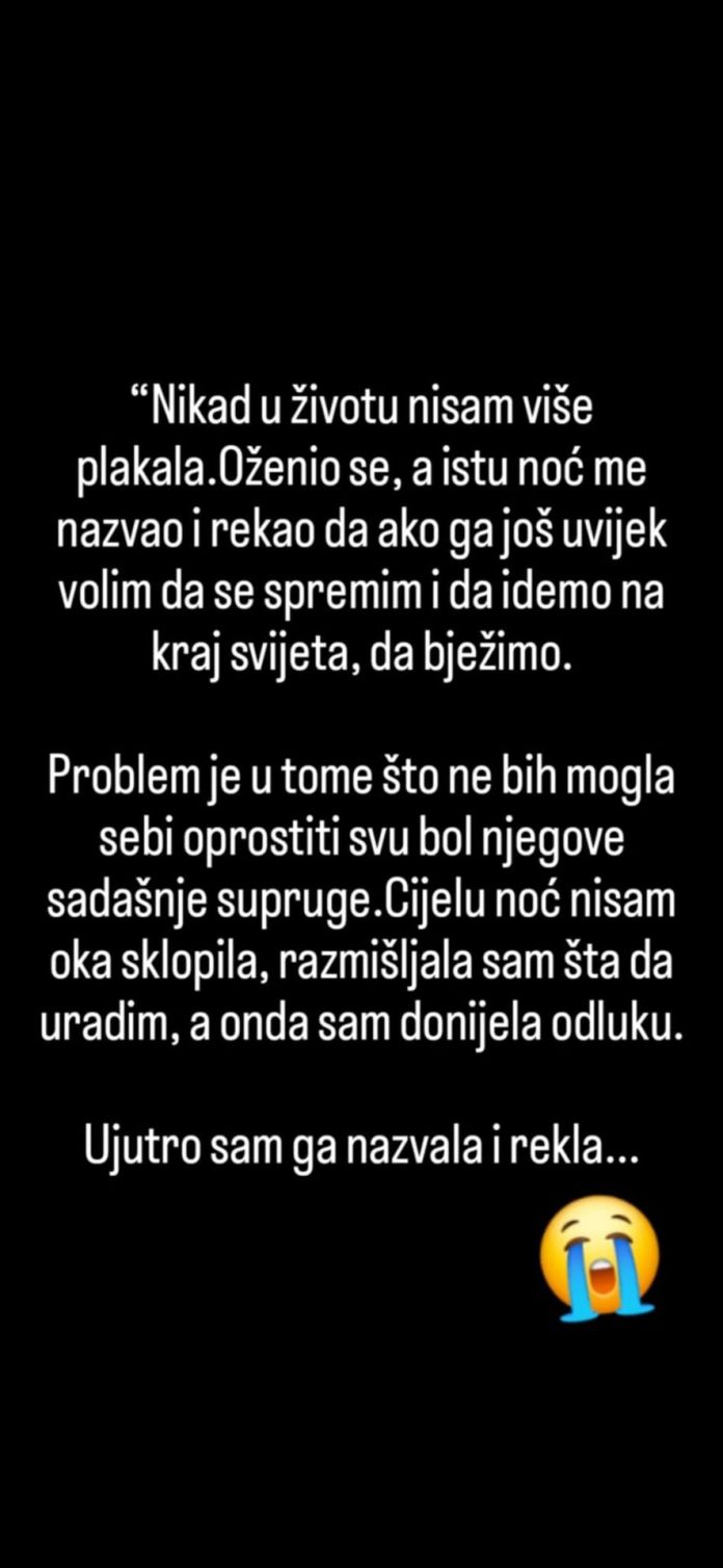 Sve je počelo jedne noći koja je za nju bila najduža u životu. Dok su drugi mirno spavali, ona je sjedila u mraku svoje sobe, boreći se sa emocijama koje su je preplavile kao nikada prije. Nikada, kaže, nije plakala toliko snažno, tako tiho i tako dugo. Vijest da se on oženio pala je na nju kao hladan tuš, iako je dio nje znao da taj trenutak neumoljivo dolazi. No ono što nije očekivala bila je njegova poruka te iste večeri — poziv koji je sve pokrenuo iznova.