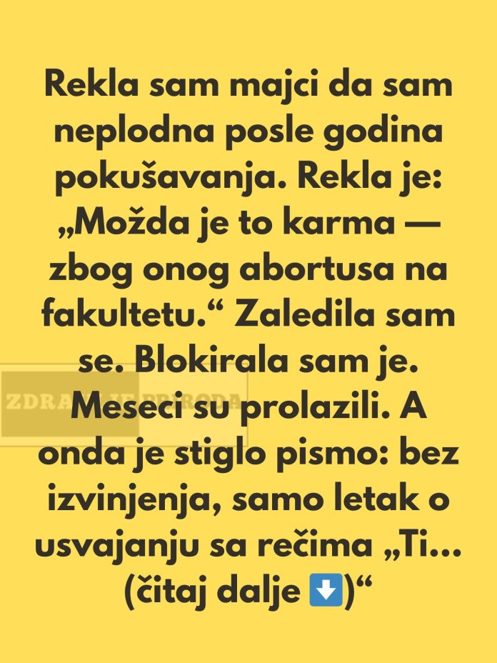 Međutim, ono što mi je rekla, nije bilo ono što sam očekivala. Njene reči su bile nešto što me zateklo: „Možda je to karma zbog onog abortusa na fakultetu. Život ima način da nas nauči lekcijama.” U tom trenutku nisam znala šta da kažem, pa nisam ni odgovorila. Samo sam otišla, povređena njenim stavom, osećajući da me nije podržala na način na koji sam očekivala.