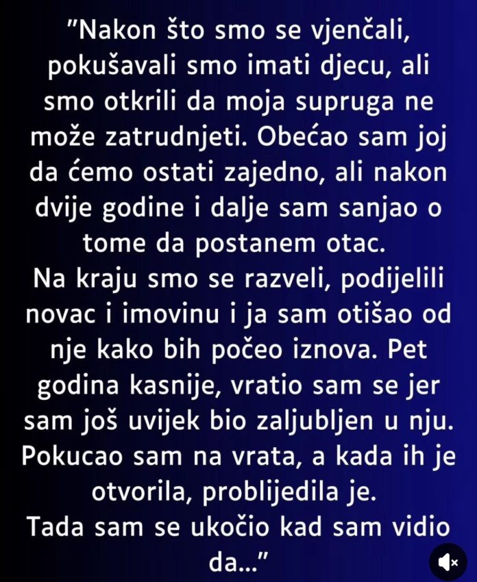 Ipak, negdje duboko u sebi, nosio je bolnu tišinu – želju da postane otac, koja je svakim danom postajala sve snažnija. Dvije godine pokušavao je uvjeriti sebe da će mu ljubav biti dovoljna, da će moći živjeti bez djece, ali srce mu je govorilo drugačije. Na kraju, kada je pritisak postao nepodnošljiv, oni su donijeli odluku da se razvedu. Razdvojili su imovinu, podijelili novac, a on je otišao kako bi pokušao početi ispočetka.