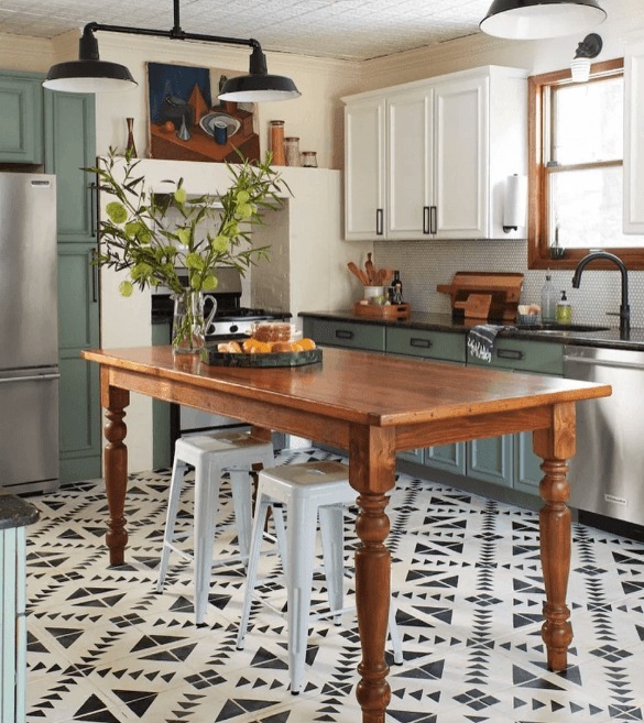 Najzanimljiviji dio projekta bio je način na koji su riješili izgled pločica. Umjesto da plaćaju skupu zamjenu, par je posegnuo za rješenjem koje je u potpunosti u njihovom DIY duhu – iskoristili su šablone kako bi na postojeće pločice nanijeli crne geometrijske uzorke. Svaki potez četkice pretvarao je običnu podlogu u moderan, elegantan zid pun karaktera. Zahvaljujući ovom pristupu, kuhinja je dobila dizajnerski izgled bez ijednog nepotrebnog troška. Uzorci su unijeli dinamiku i učinili da prostor djeluje impresivno, a opet jednostavno.