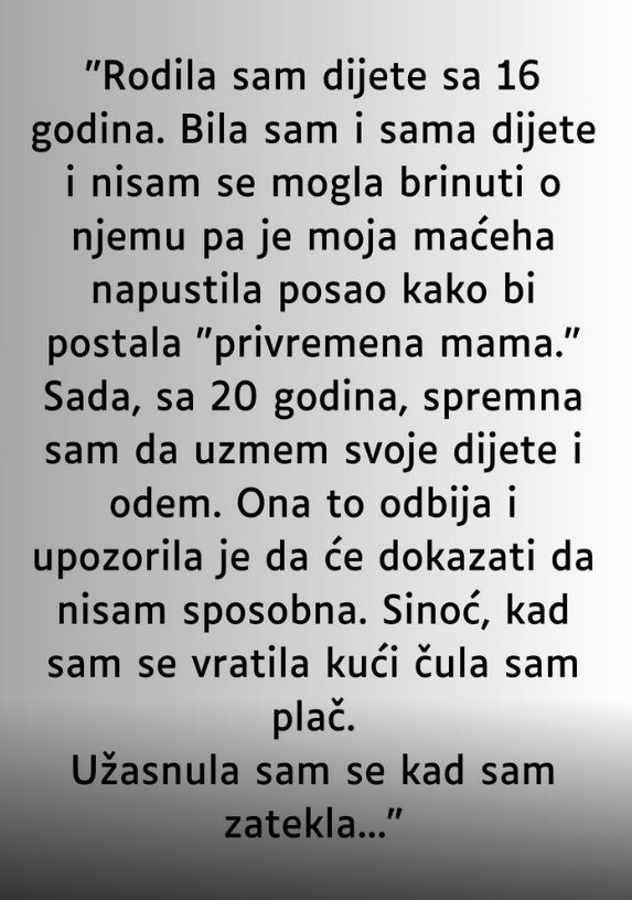 Kao 16-godišnja majka, bila je suočena s realnošću odgajanja deteta u vrlo mladim godinama. Pomoć njene macehe, koja je na neki način preuzela ulogu majke, bila je ključna za njen opstanak i preživljavanje teških trenutaka. Međutim, što se više vremena provodilo, to je odnos postajao složeniji, jer su emocije, međuljudski konflikti i duboki nesporazumi stvorili nesređene temelje u porodici. Maceha, koja je napustila svoju karijeru kako bi se posvetila odgajanju unuka, doživljava duboko razočaranje kada vidi da njena žrtva možda nije prepoznata. Odlučuje da se povuče i krene, uzimajući sa sobom novac koji je tokom godina stvorila, i ostavlja pismo u kojem je jasno izražena njena povređenost i ljutnja.