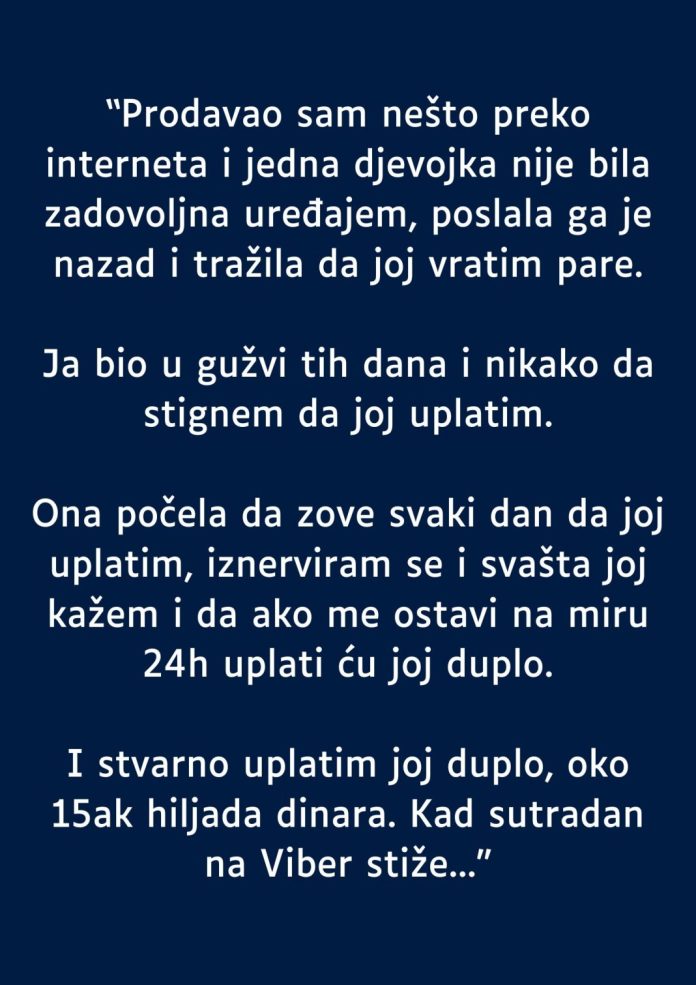 Ovo je priča o tome kako su trenutak ljutnje i napetosti mogli dovesti do nečega potpuno drugačijeg nego što je bilo očekivano.Kao što mnogi od nas znaju, online prodaja može biti pravi test strpljenja, a ni ja nisam bio iznimka. U jednoj od tih situacija, suočio sam se s nezadovoljnim kupcem koji je zahtijevao povrat novca za uređaj koji je kupila, a ja nisam bio u mogućnosti odmah ispuniti taj zahtjev.