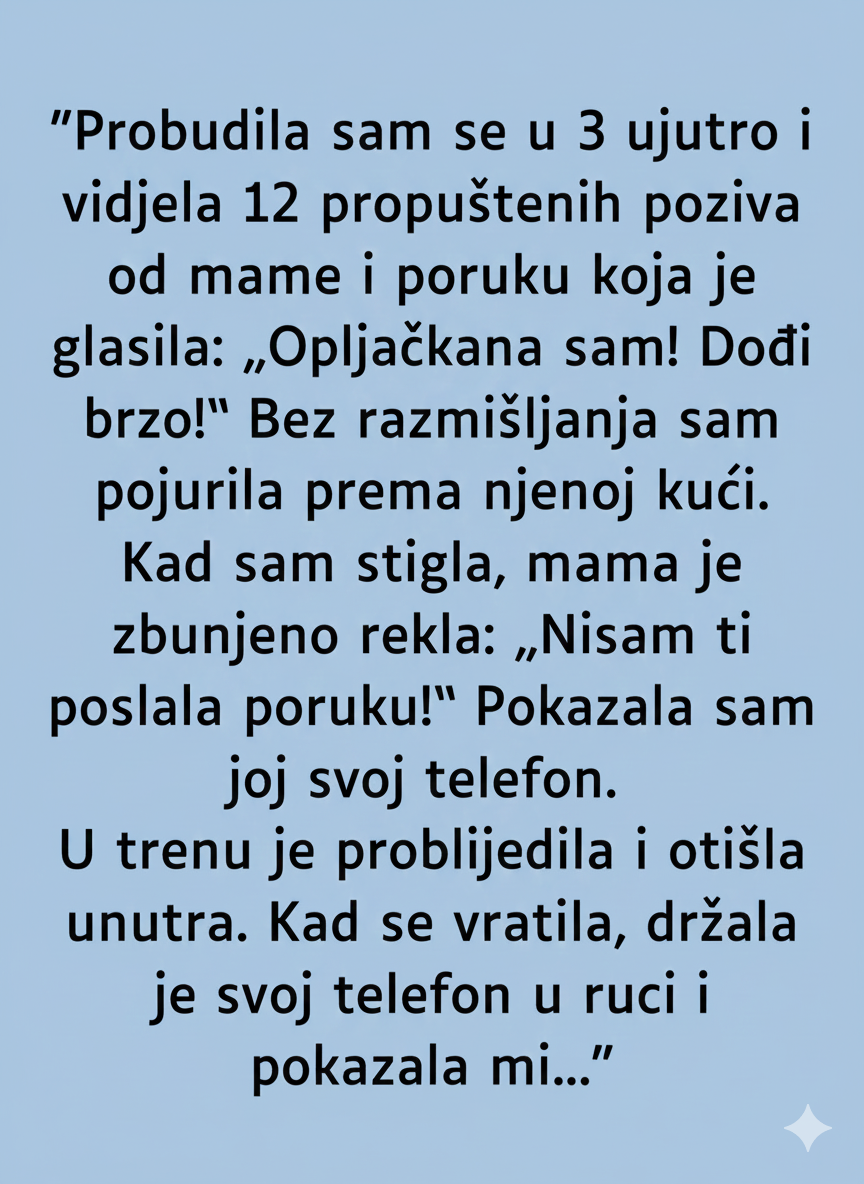 Ako ste ikada razmišljali o tome što bi se moglo dogoditi kada bi vaša privatnost bila ugrožena, ovo je priča koja će vas natjerati da se zapitate što je stvarno sigurno.Bilo je 3 ujutro kada je žena iz priče primila poruku koja ju je potpuno izbacila iz ravnoteže. Na ekranu njenog telefona bila je poruka od mame u kojoj je pisalo: „Opljačkana sam!