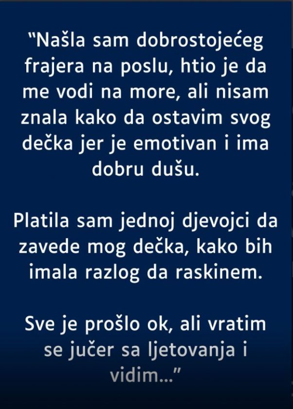 Priča počinje susretom sa muškarcem koji je bio potpuno različit od onih koje je poznala do tada. Harizmatičan, šarmantan i uspešan, odjednom je postao njen oslonac i pružio joj pažnju koja joj je nedostajala. Na prvi pogled, ponuda da zajedno odu na more delovala je kao prilika koju nije želela da propusti. Međutim, bilo je jedno “ali”. Naime, bila je u vezi s dečkom koji, iako nije bio savršen, bio je iskren, emotivan i dobar prema njoj. Zamišljala je da se njena sreća nalazi negde drugde, ali nije znala kako da okonča vezu sa partnerom, a da ne povredi njegove emocije.
