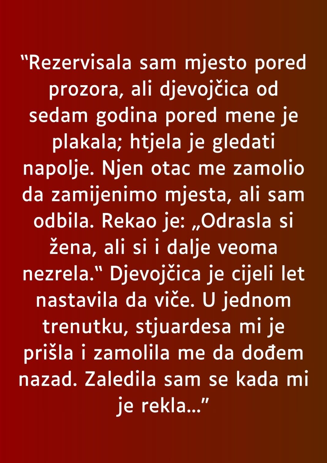 Jedan let, jednostavna odluka o rezervaciji mjesta, a ipak – trenutak koji je potpuno promijenio njenu perspektivu. Mlada žena je, kao i mnogi putnici, uživala u udobnosti svog mjesta pored prozora. Međutim, sve se počelo mijenjati kad je iznenada došla do nje djevojčica koja je počela plakati.