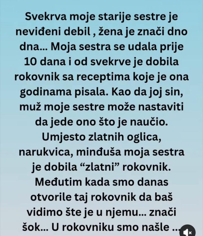 Nakon svadbe, ponosno je prišla mladoj snahi i uručila joj svoj poklon, očekujući vjerovatno zahvalnost i oduševljenje. A unutra — ne nakit, ne nešto simbolično, ne predmet vrijednosti, već rokovnik. I to ne bilo kakav, nego rokovnik koji je godinama popunjavala svojim ličnim receptima. Svekrva ga je čuvala kao dragocjenu zbirku znanja i odlučila da baš to treba budućoj domaćici u porodici.