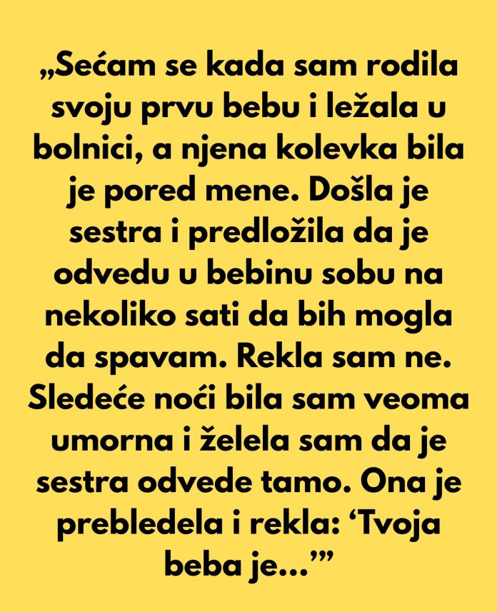 Međutim, sledećeg dana, umorna i iscrpljena, zatražila je od sestre da bebu odvedu u bebinu sobu na nekoliko sati, kako bi mogla da se odmori. Iako je bila potpuno izmorena, želja da beba bude sa njom bila je snažna. Iznenađujuće, sestra je u tom trenutku prebledela i izgovorila nešto što ju je duboko pogodilo: „Vaša beba treba da ostane s vama u sobi. Mi nemamo bebinu sobu. Niko nikada ne bi došao da uzme vašu bebu!”
