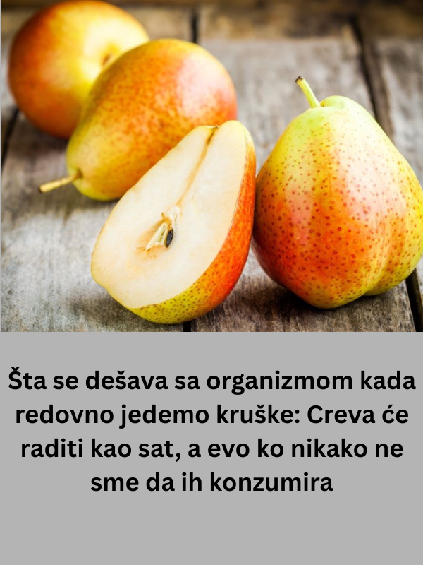 Kruške sadrže visok nivo vode i vlakana, što doprinosi zdravoj, mekšoj stolici. Ova karakteristika pomaže u eliminaciji toksina iz organizma. Fruktoza, koja se nalazi u kruškama, takođe ima blagi laksativni efekat, što dodatno pomaže u detoksikaciji tela i održavanju zdrave probave. Uz to, vlakna u kruškama pomažu da se reguliše ravnoteža u crevima i smanjuje rizik od zapušenja.