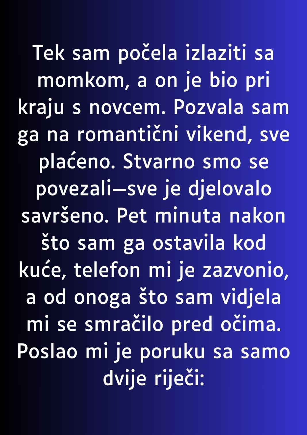 Jedan mladi par je upravo započeo svoju romantičnu vezu. U početku je sve išlo savršeno – upoznavali su se, provodili kvalitetno vrijeme zajedno i čak su planirali vikend iz snova. Da bi olakšala svom momku, koji je bio na kraju s novcem, ona je odlučila preuzeti troškove. Romantični vikend, lijepi trenuci, osjećaj povezanosti – sve je bilo kako treba. Ali, nakon što su se rastali i ona ga je ostavila kod kuće, dogodila se stvar koja joj je potpuno promijenila pogled na situaciju.