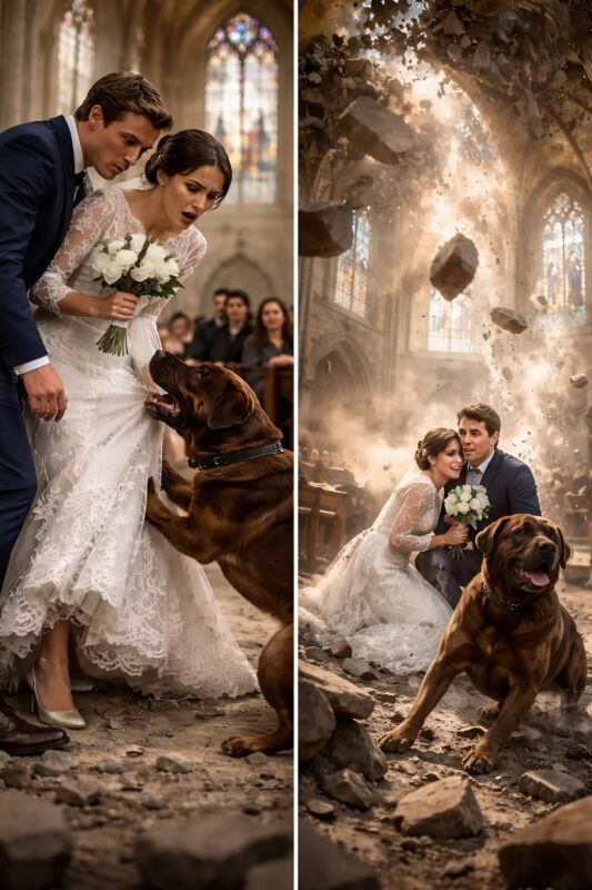 Pas je cijelu ceremoniju promatrao mirno, poput tihog svjedoka, gotovo kao da je razumio koliko je ovaj trenutak važan za njegovu vlasnicu. No, tek kad su mladenci krenuli prema oltaru, pas je iznenada reagirao. Niko nije mogao predvidjeti što će se dogoditi sljedeće. Pas je skočio, zubima uhvatio za šlep vjenčanice mladenke i počeo vući. Lajanje je postalo sve glasnije, a ponašanje psa je bilo potpuno izvan kontrole.
