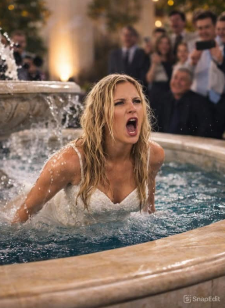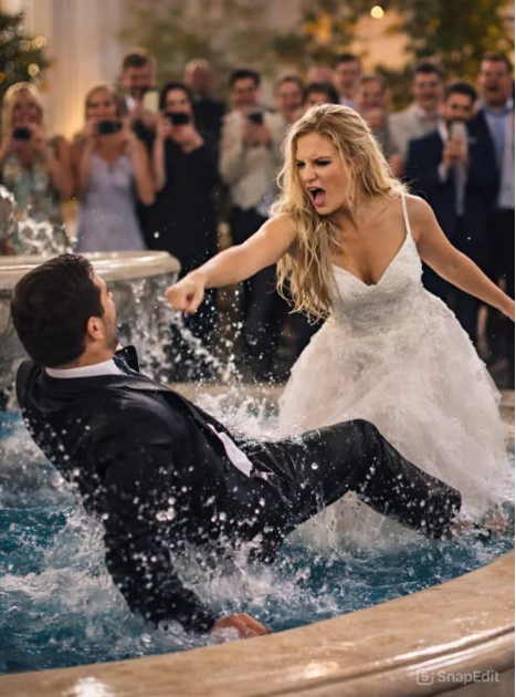 Mladoženja je iznenada podigao ruku i, u trenutku kada nevjesta nije imala vremena da reagira, jednostavno je gurnuo. Nevjesta je izgubila ravnotežu i, prije nego što je mogla shvatiti što se događa, već je padala u vodu. Haljina joj je postala teška, frizura se raspala, a šminka je počela curiti niz njeno lice. Gosti su zastenjali, a cijela situacija postala je mračna, s muzikom koja je iznenada prestala.
