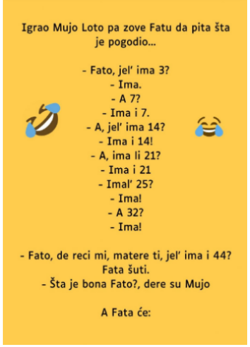 Vicevi su kratke priče koje imaju šaljivi sadržaj i kojima se želi nasmijati publiku ili čitatelja. U nastavku vam donoismo jedan koji je jako popularan na društvenim mrežama a u glavnim ulogama su Mujo i Fata.