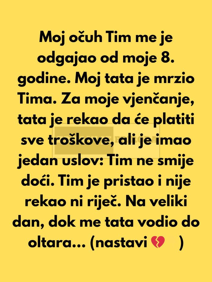 Nisam znala što učiniti kada je došao trenutak mog vjenčanja. Željela sam da moj otac bude prisutan i da me isprati do oltara. Moje srce bilo je podijeljeno jer sam voljela i poštovala svog očuha, koji me odgajao i bio uz mene kroz sve. Moj otac je pristao doći, ali pod uvjetom da Tim ne bude prisutan na vjenčanju. Taj uvjet slomio je moje srce, jer nisam željela nanijeti Tima toliku bol, ali nisam imala izbora. Možda nisam željela da moj otac bude razočaran, a gubitak majke učinio me ranjivijom. Tim nije postavljao nikakva pitanja, pristao je na to i nije govorio ništa, ali osjećala sam da ga gubim.