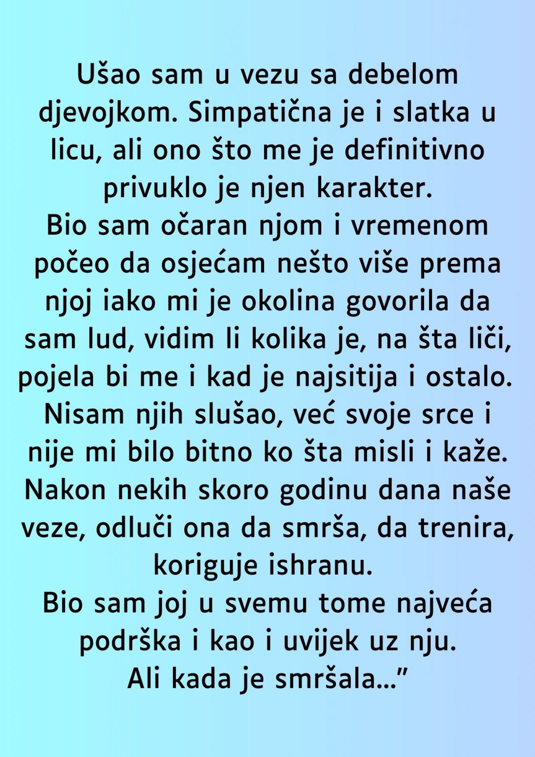 Ovaj tekst će biti o iskustvu jednog mladića koji je bio u vezi sa djevojkom koja je prošla kroz velike fizičke promjene, ali to nije bio jedini faktor koji je utjecao na njihovu vezu.